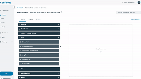 - Select the Information and Instruction Text field and drag it into the form builder on the right.