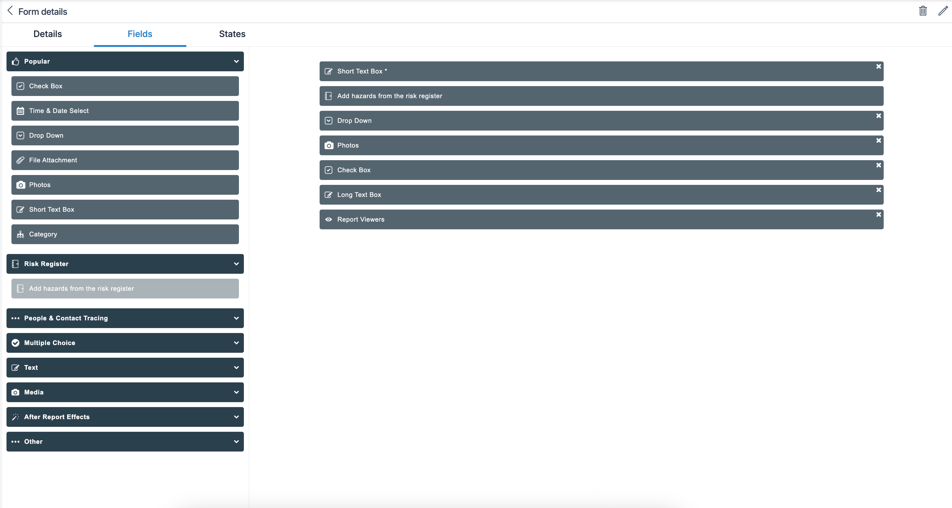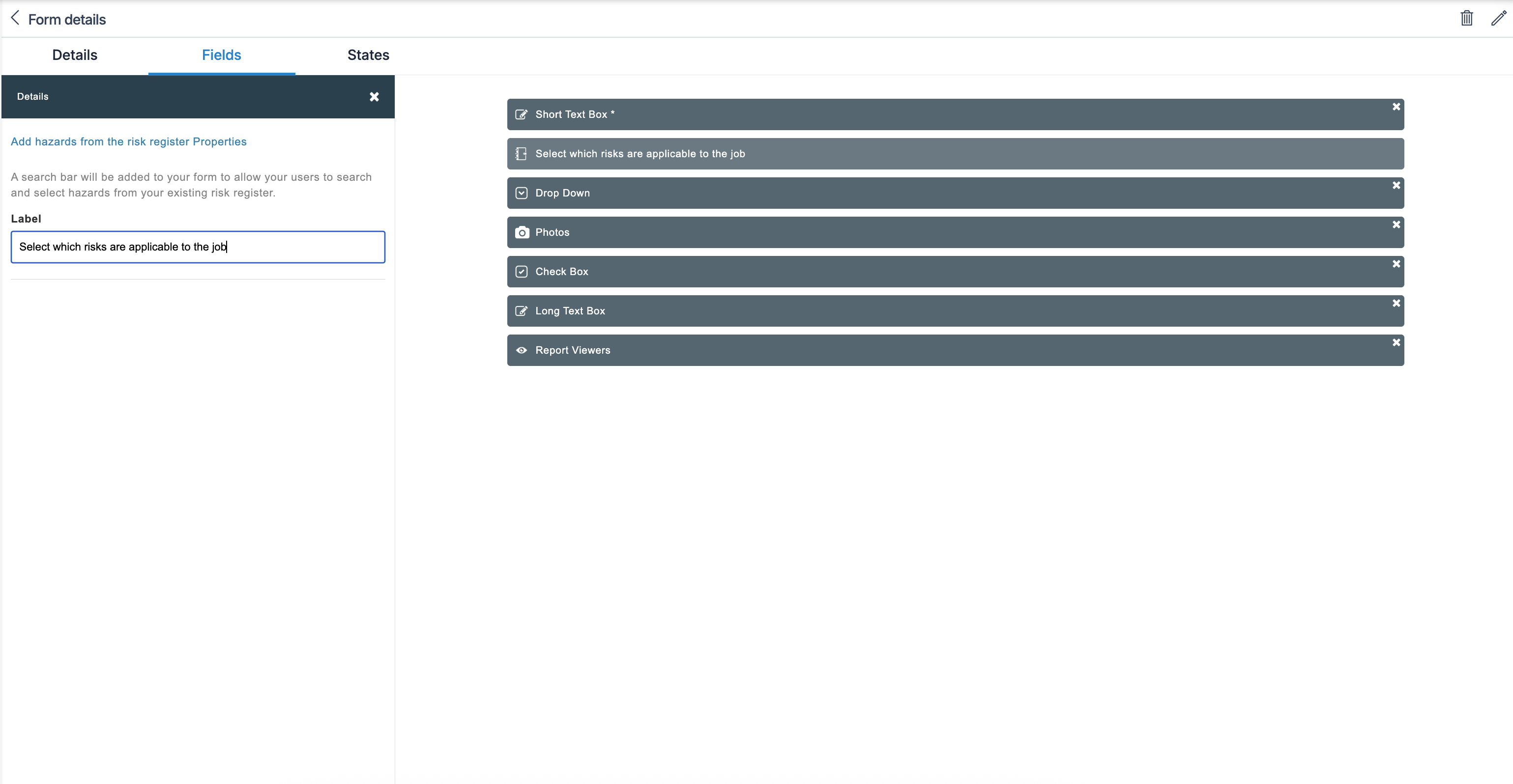 - In the form builder, select Risk Register and drag the Add hazards from the Risk Register field into your form.